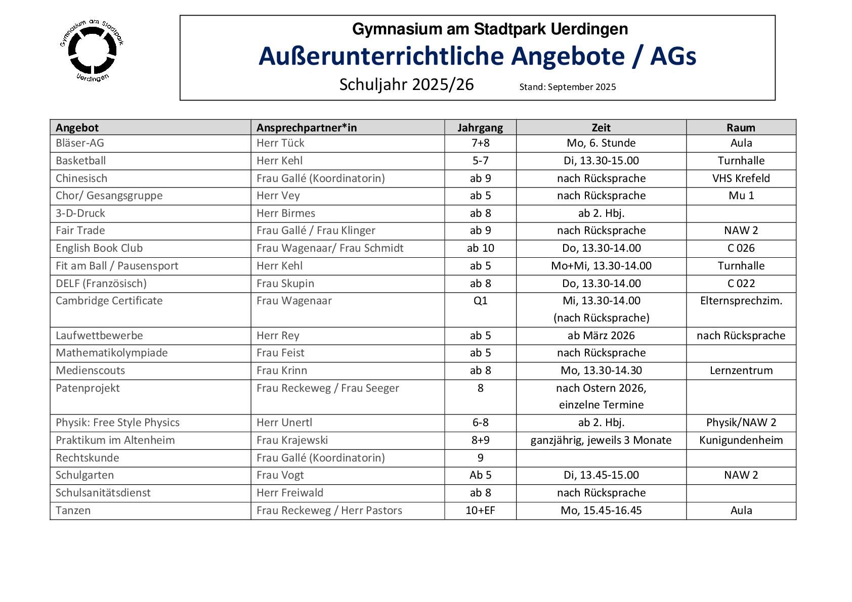 Außerunterrichtliche Angebote und Arbeitsgemeinschaften 2025/26