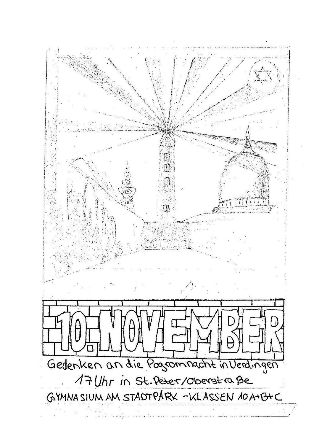 Deswegen laden wir Euch und Sie alle zusammen mit den Uerdinger Gemeinden St. Nikolaus und der evangelischen Gemeinde der Michaelskirche zum diesjährigen Pogromgedenken am 10.11. um 17h in die Kirche St. Peter in der Oberstraße ein. Schülerinnen und Schüler der Jgst. 10 haben das Gedenken im Rahmen des Religionsunterrichts vorbereitet.