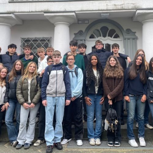 Aus diesem Grund hat die Klasse 9b mit der Geschichtslehrerin Frau Hopmann am 5.5.25 einen Ausflug zur Villa Merländer gemacht. Angekommen an der Gedenkstätte wurde die Klasse freundlich von Frau Feldmann, der Museumsführerin, empfangen. Nach der Begrüßung nahm die Klasse in einem der Räume der Villa platz, während Frau Feldmann Grundlegendes zur Villa erklärte.