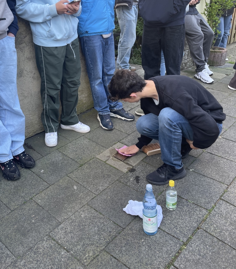 Am nächsten Morgen haben wir dann in unseren Geschichtsstunden verschiedene Stolpersteine in Uerdingen aufgesucht. Dazu haben wir die App „Stolpersteine NRW“ benutzt, mit deren Hilfe wir einiges über die Menschen erfahren konnten, für die diese Stolpersteine verlegt wurden. Es ist erschreckend zu sehen, wie viele Stolpersteine allein in Uerdingen liegen. Auch die Gedenkstelle für die 1938 geschändete Synagoge haben wir gemeinsam aufgesucht.