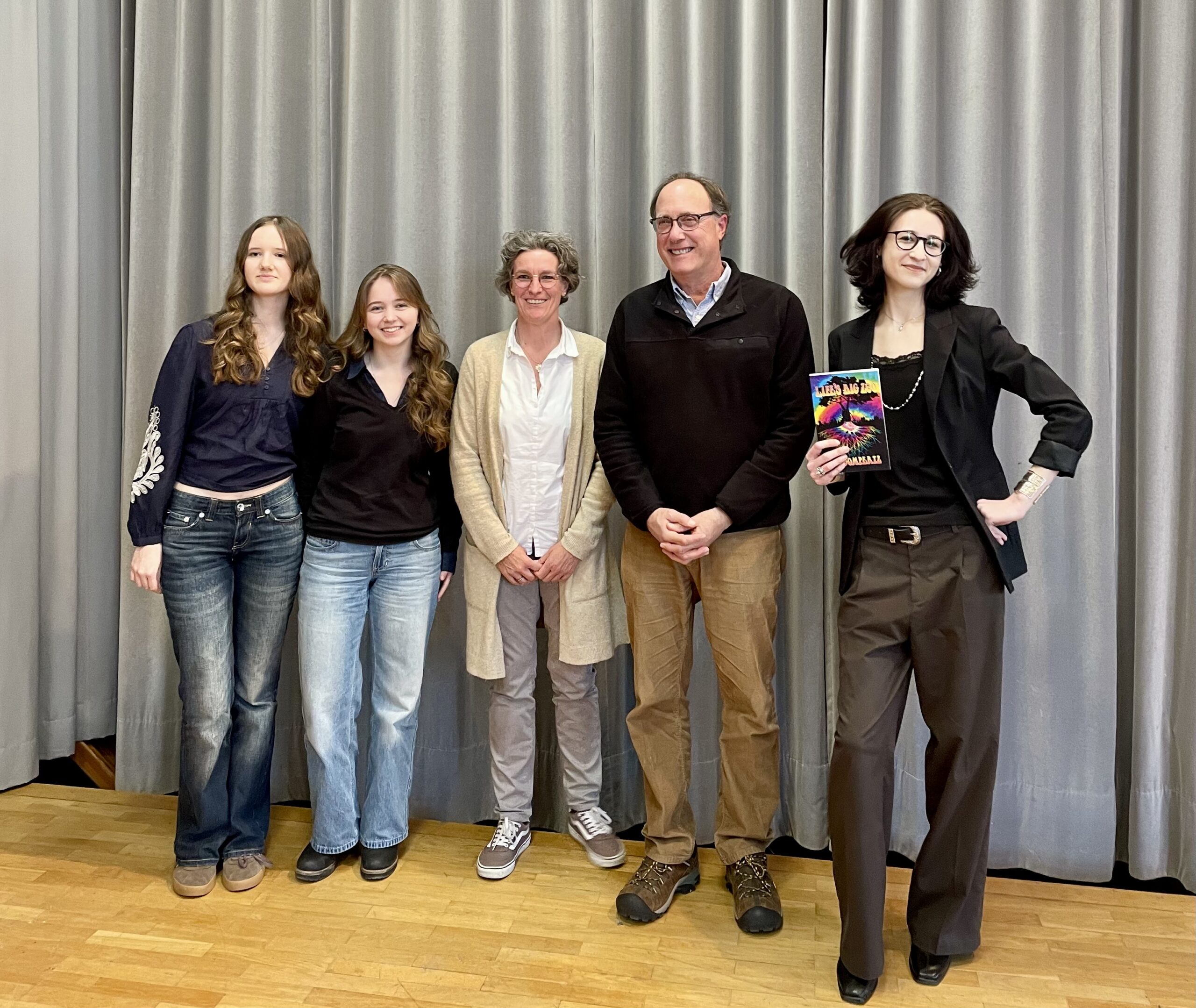 Eine kleine Gruppe von Schülerinnen hatte Gelegenheit, vor dem Vortrag vor ca. 200 Schülerinnen und Schülern der Klassen 9 und 10, Ron in einem halbstündigen Interview Fragen zu stellen. Dabei ging es einerseits um die Lebensgeschichte von Rolf Gompertz und seiner Eltern, andererseits aber auch um die Bedeutung der Aufarbeitung und der Erinnerung an die Verbrechen der Nationalsozialisten für uns in Deutschland und weltweit. So wurde abschließend auch über Vergleichspunkte in der Gegenwart in den USA und Deutschland diskutiert.