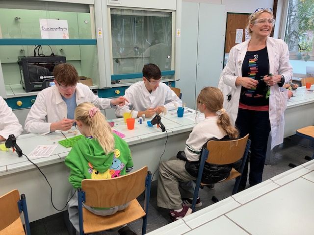 Unter den vielfältigen Stationen waren die chemischen Kunstwerke, selbst fabrizierter „Slime“ und das Knobeln an digitalen Rätseln die Highlights. Die Kinder waren begeistert und experimentierten mit viel Enthusiasmus. Besonderes Lob verdienen die Schüler*innen der EF, welche die Grundschüler*innen tatkräftig an allen Stationen unterstützen und ihre Sache einfach super machten.