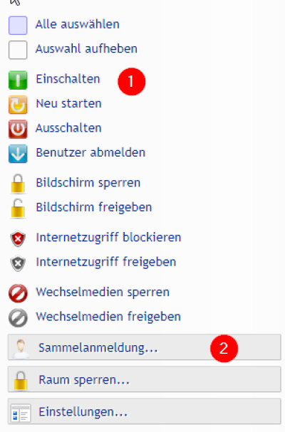 Schalten Sie ggf. über den KRZN-Userdesk alle Computer an (1) und klicken Sie dann auf Sammelanmeldung.