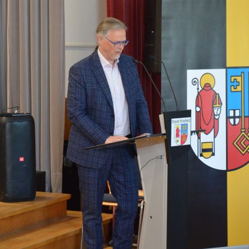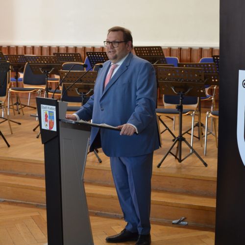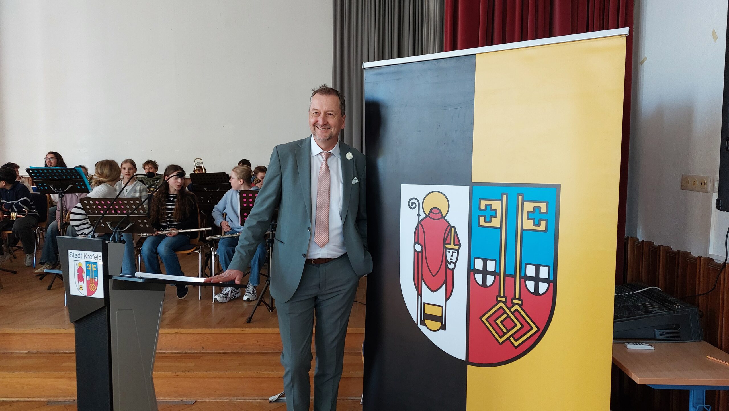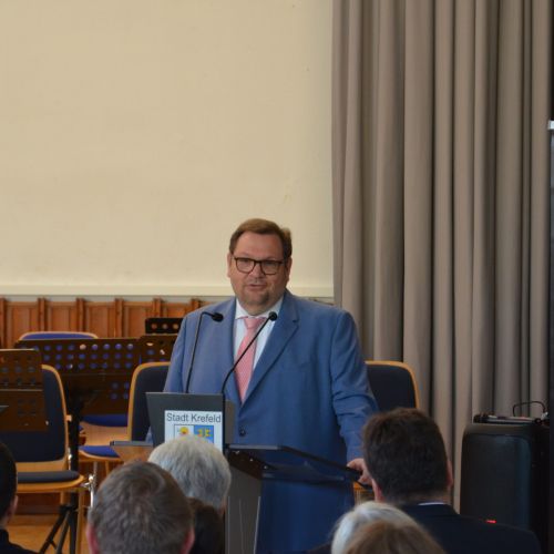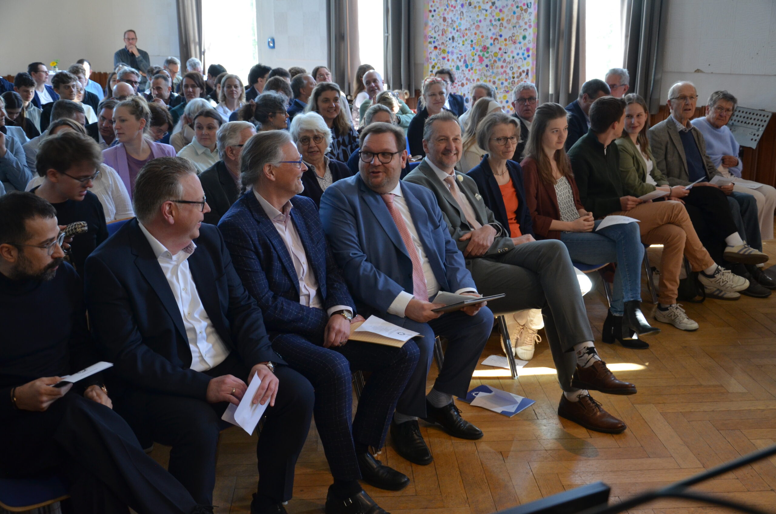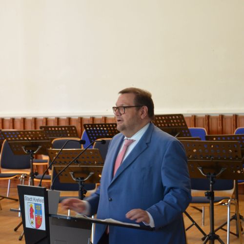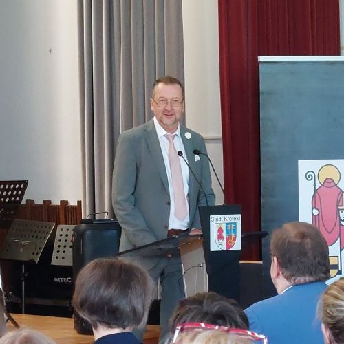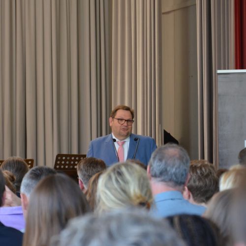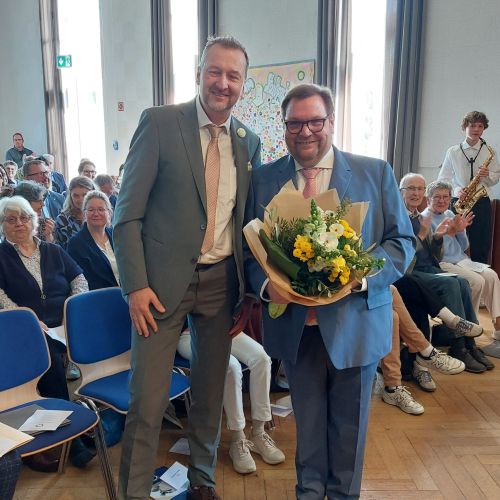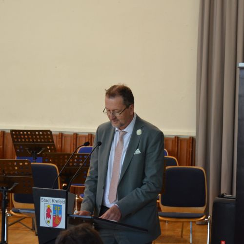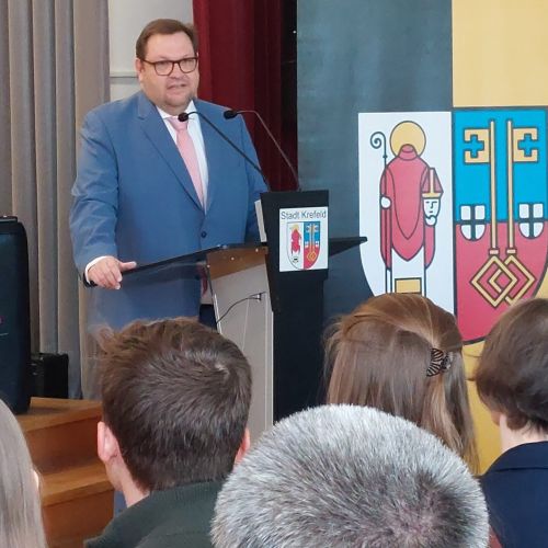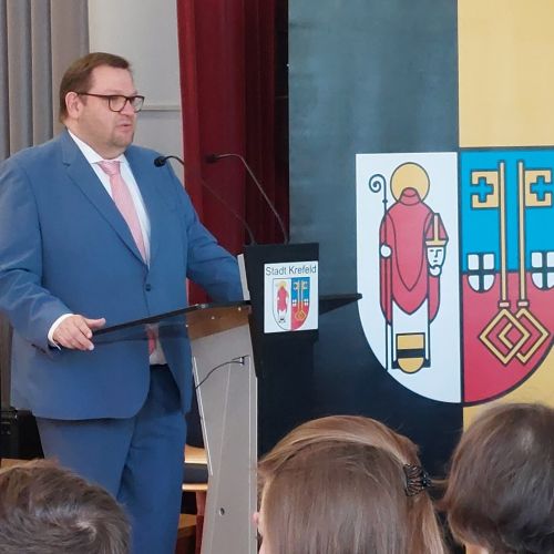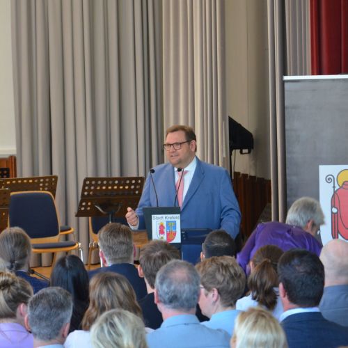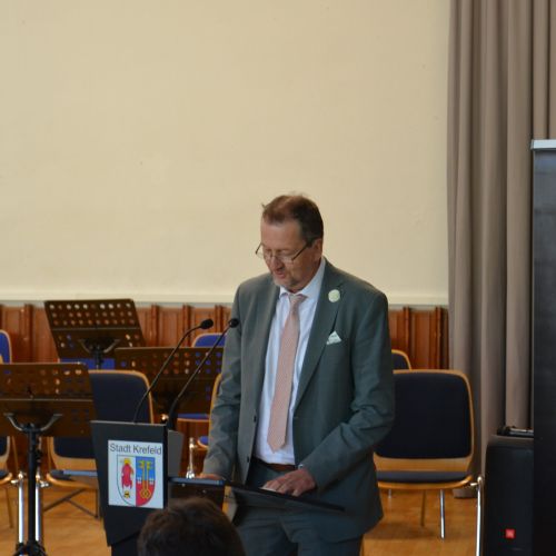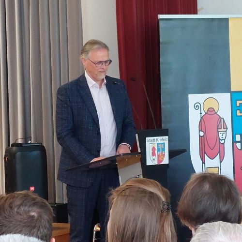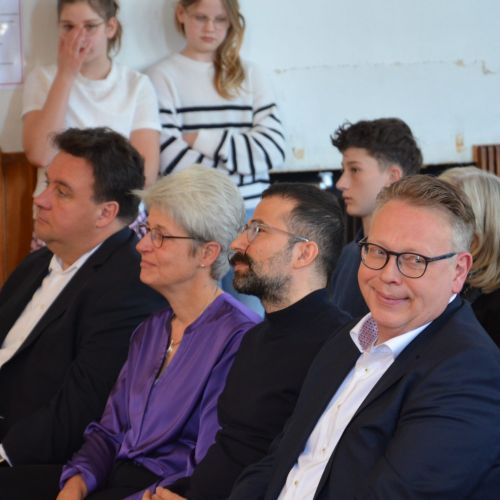 Oberbürgermeister Frank Meyer, Schuldezernent Stefan Holtschneider, Landtagsabgeordneter Marc Blondin, um nur einige zu nennen: Viel Prominenz war zur offiziellen und feierlichen Amtseinführung von Stefan Kleeberg vertreten. Zusammen mit der Familie des neuen Schulleiters, den Kolleginnen und Kollegen, Vertreterinnen und Vertretern aus der Schülerschaft, der Elternschaft und vielen weiteren Weggefährtinnen und -gefährten wurde dieses Ereignis in der prall gefüllten Aula gebührend begangen und gefeiert. Das nicht nur in verschiedenen Reden, wie z.B. durch den Oberbürgermeister und ehemaligen Schüler des Gymnasiums in Personalunion, sondern auch mit musikalischen Beiträgen oder einem heiteren Abschluss-Quiz, das Stefan Kleeberg mit Bravour bestand.