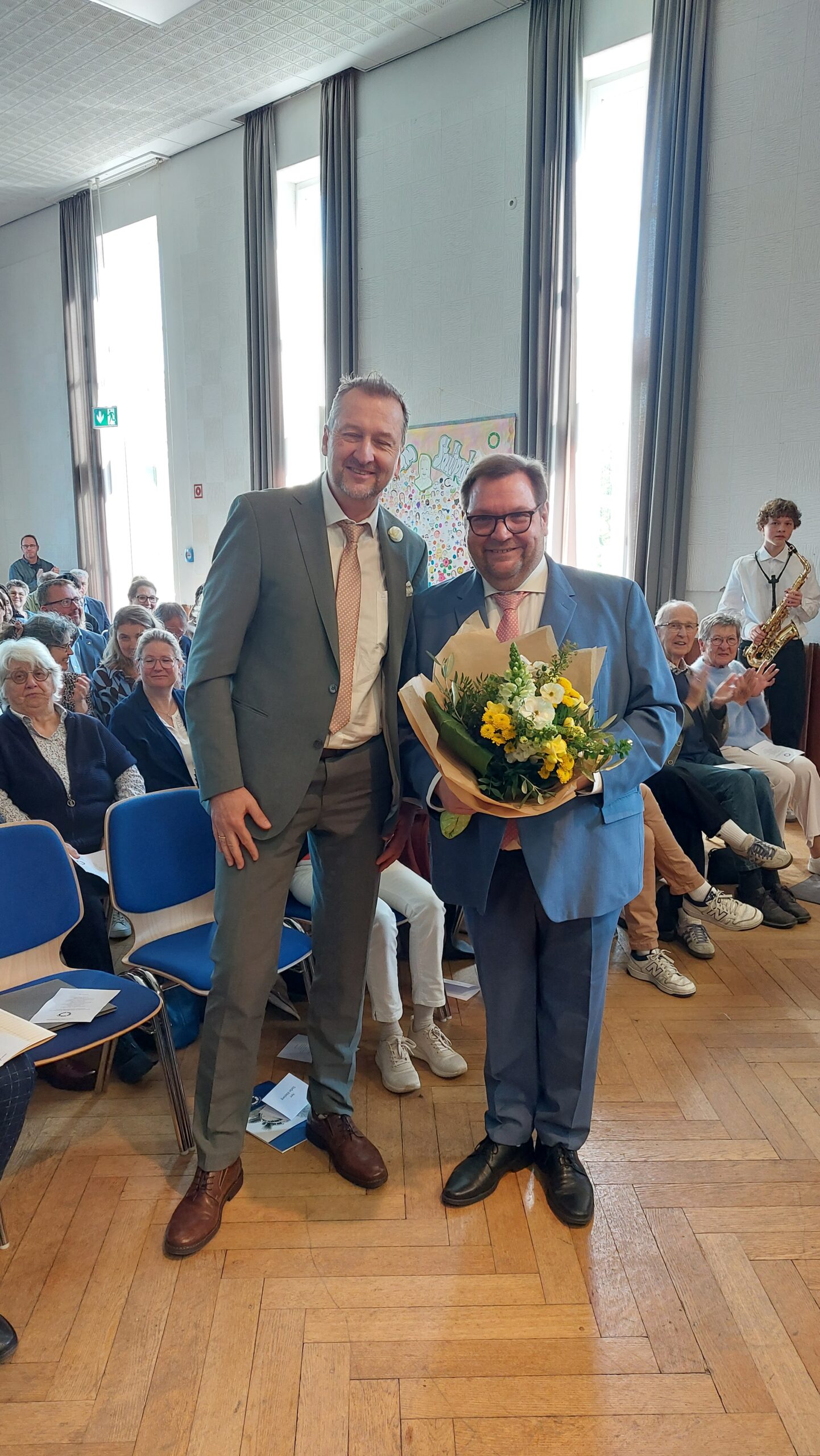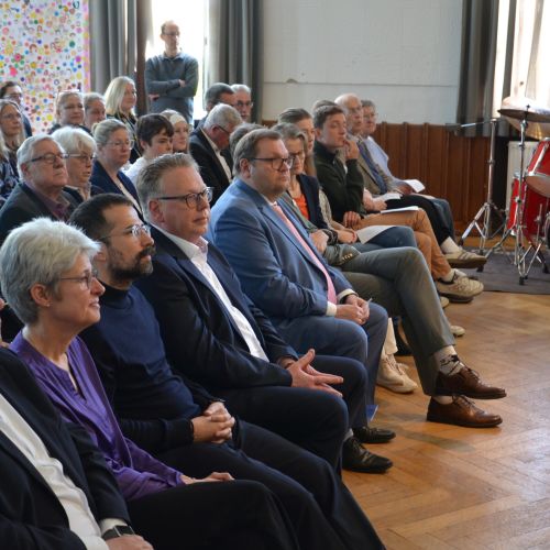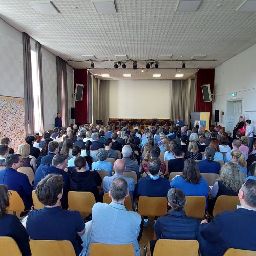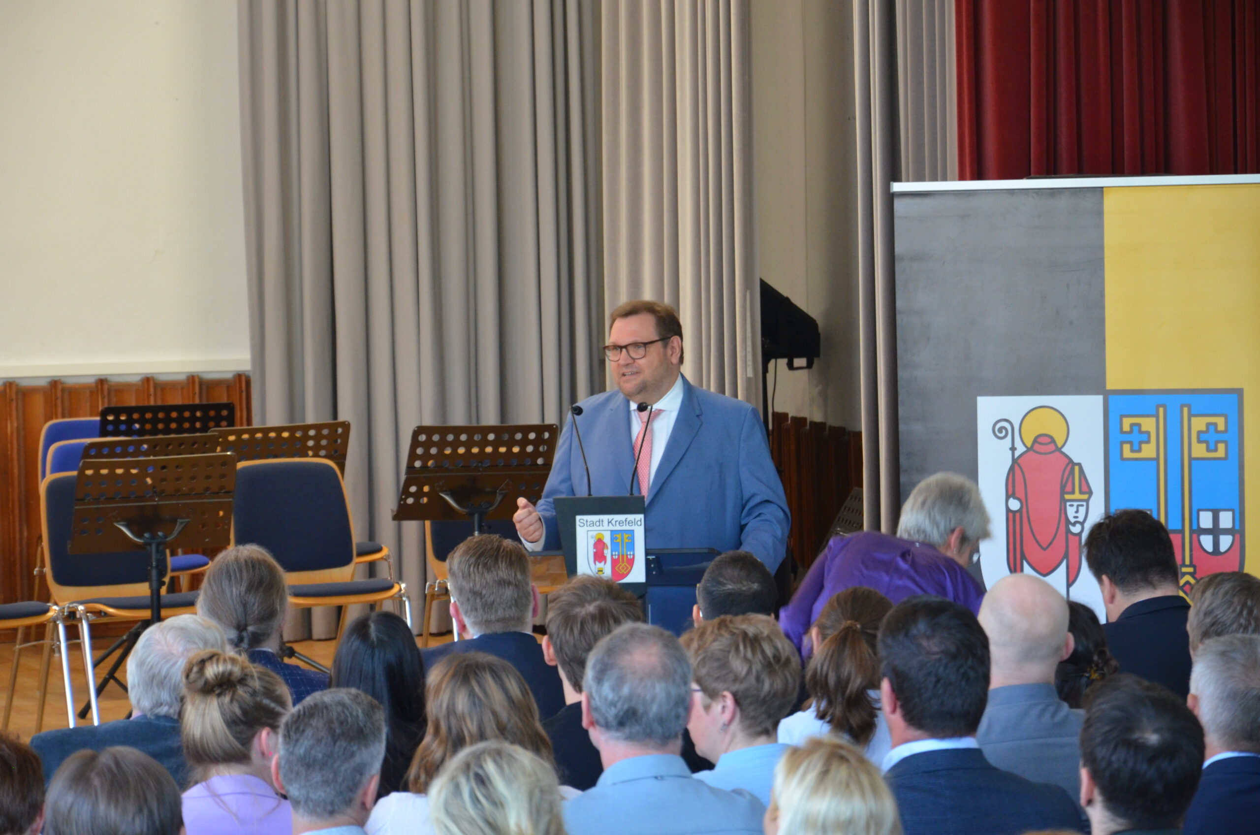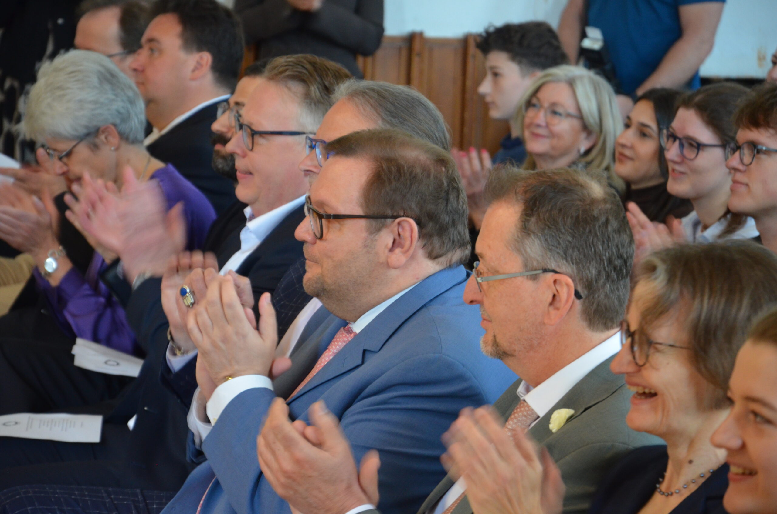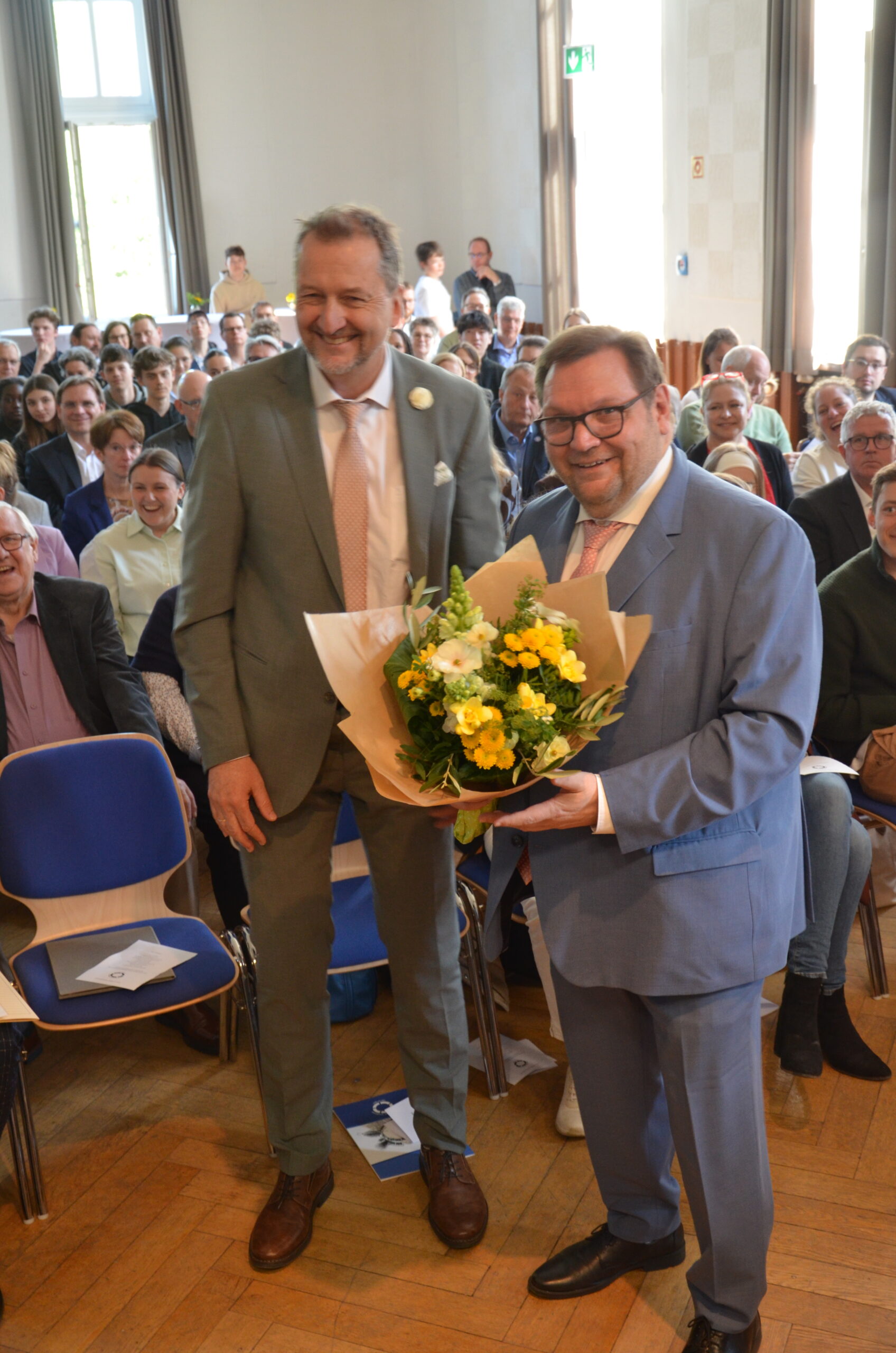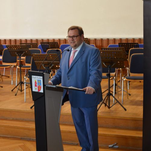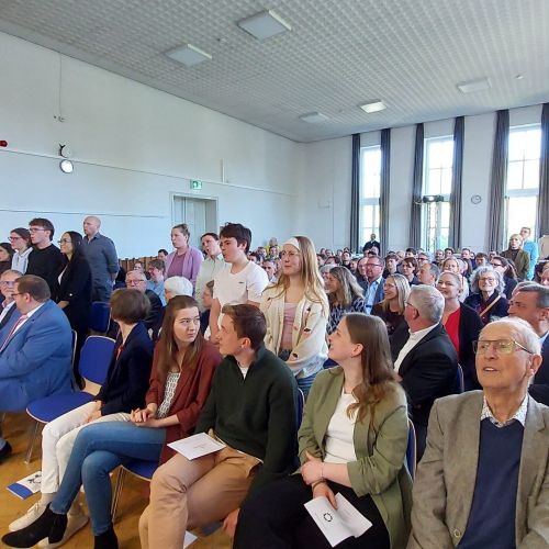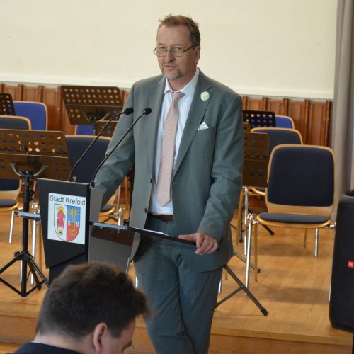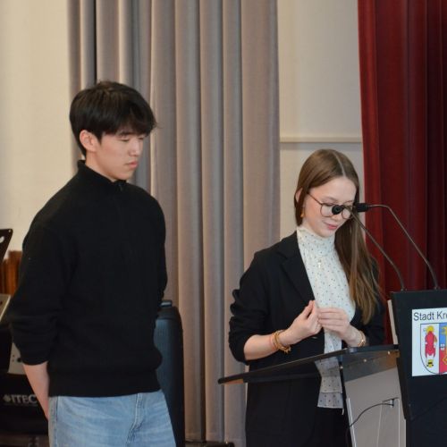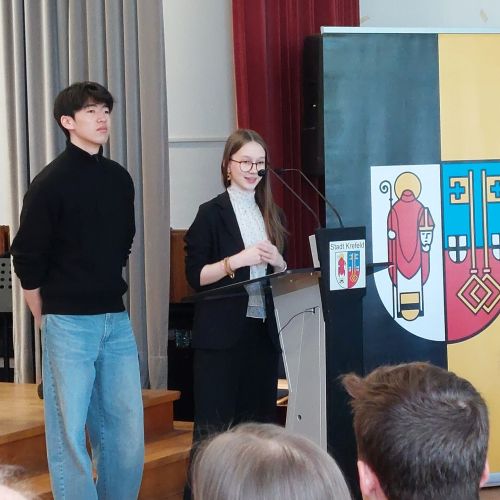 Oberbürgermeister Frank Meyer, Schuldezernent Stefan Holtschneider, Landtagsabgeordneter Marc Blondin, um nur einige zu nennen: Viel Prominenz war zur offiziellen und feierlichen Amtseinführung von Stefan Kleeberg vertreten. Zusammen mit der Familie des neuen Schulleiters, den Kolleginnen und Kollegen, Vertreterinnen und Vertretern aus der Schülerschaft, der Elternschaft und vielen weiteren Weggefährtinnen und -gefährten wurde dieses Ereignis in der prall gefüllten Aula gebührend begangen und gefeiert. Das nicht nur in verschiedenen Reden, wie z.B. durch den Oberbürgermeister und ehemaligen Schüler des Gymnasiums in Personalunion, sondern auch mit musikalischen Beiträgen oder einem heiteren Abschluss-Quiz, das Stefan Kleeberg mit Bravour bestand.