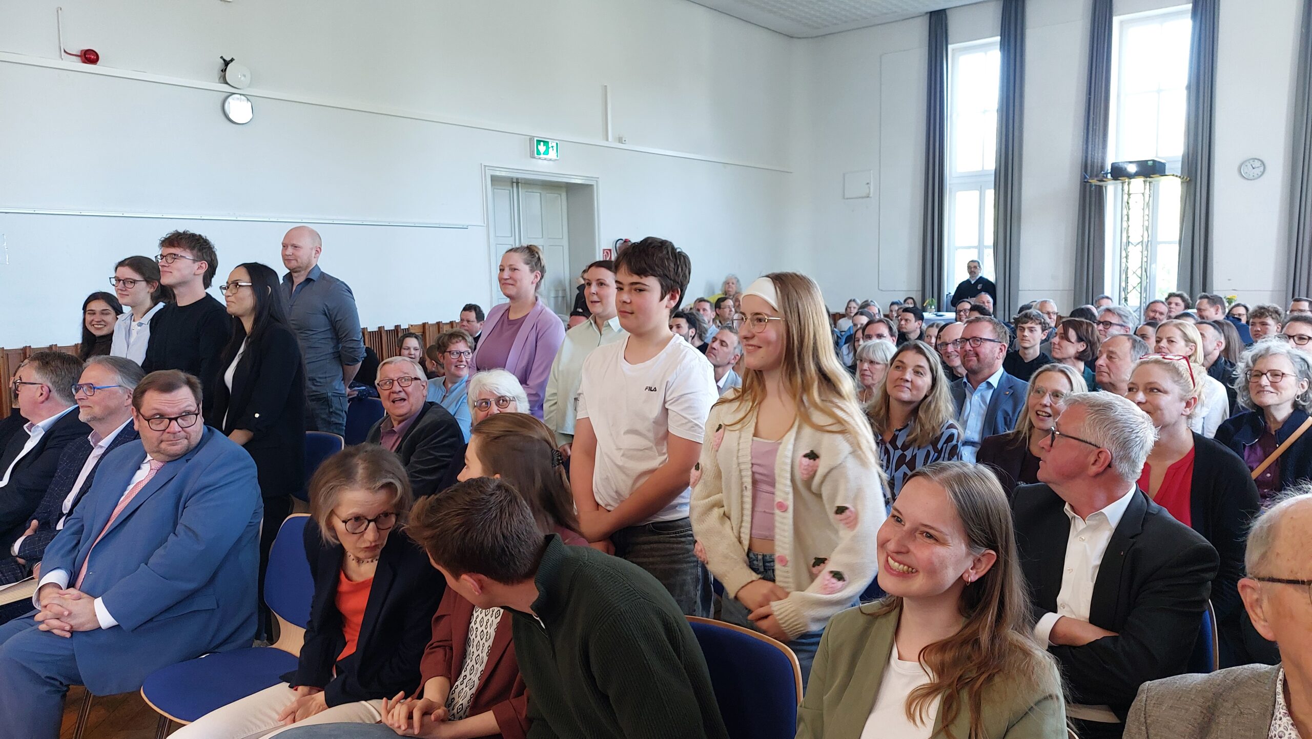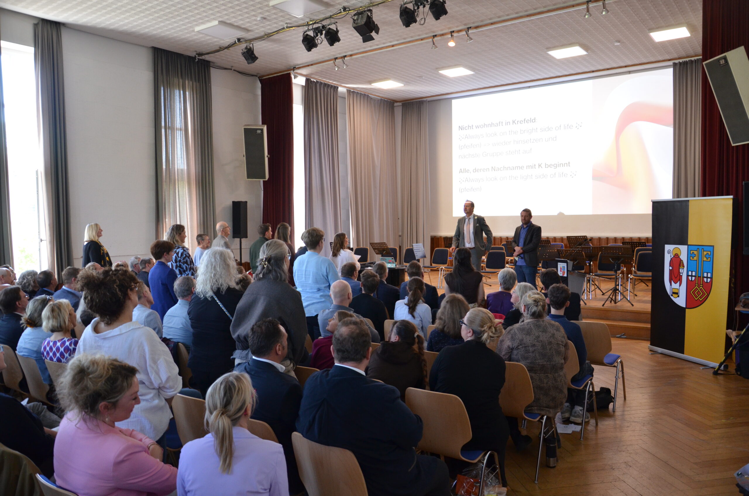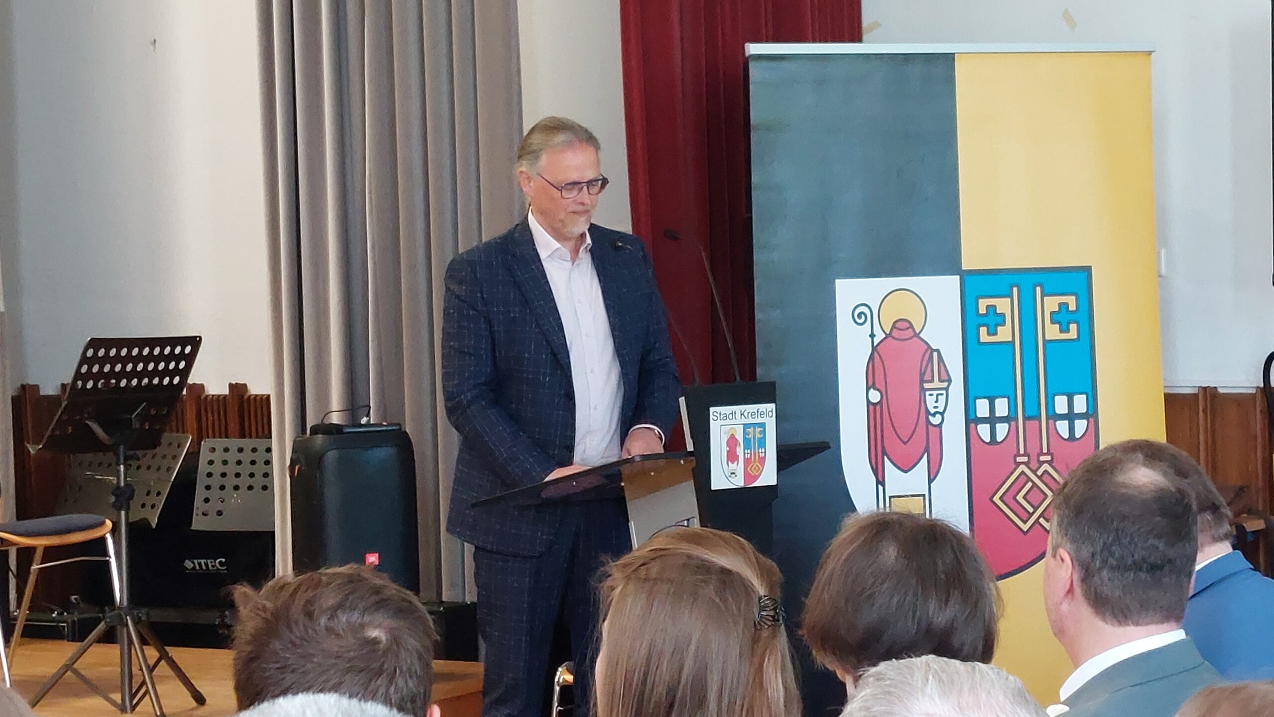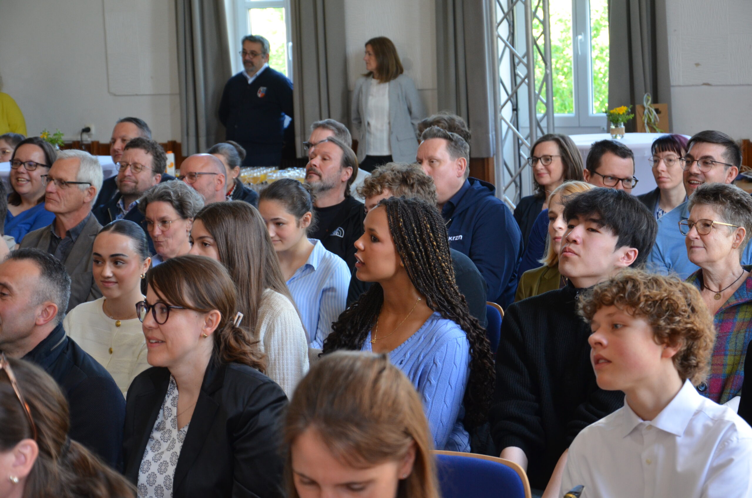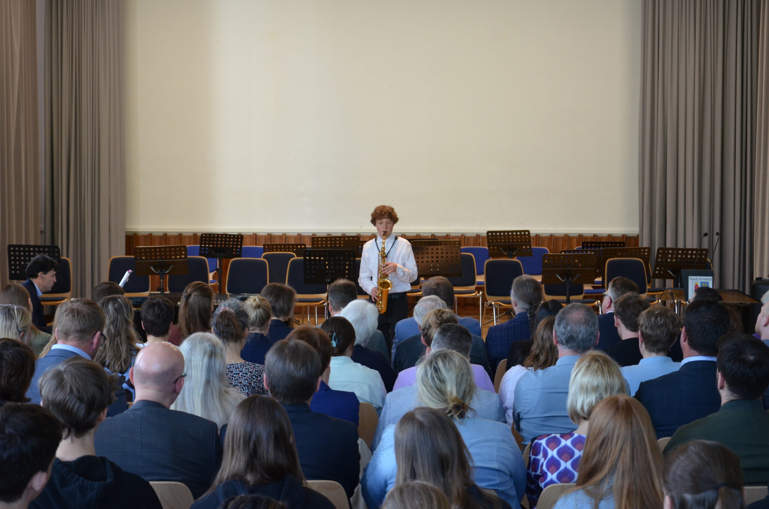 Oberbürgermeister Frank Meyer, Schuldezernent Stefan Holtschneider, Landtagsabgeordneter Marc Blondin, um nur einige zu nennen: Viel Prominenz war zur offiziellen und feierlichen Amtseinführung von Stefan Kleeberg vertreten. Zusammen mit der Familie des neuen Schulleiters, den Kolleginnen und Kollegen, Vertreterinnen und Vertretern aus der Schülerschaft, der Elternschaft und vielen weiteren Weggefährtinnen und -gefährten wurde dieses Ereignis in der prall gefüllten Aula gebührend begangen und gefeiert. Das nicht nur in verschiedenen Reden, wie z.B. durch den Oberbürgermeister und ehemaligen Schüler des Gymnasiums in Personalunion, sondern auch mit musikalischen Beiträgen oder einem heiteren Abschluss-Quiz, das Stefan Kleeberg mit Bravour bestand.