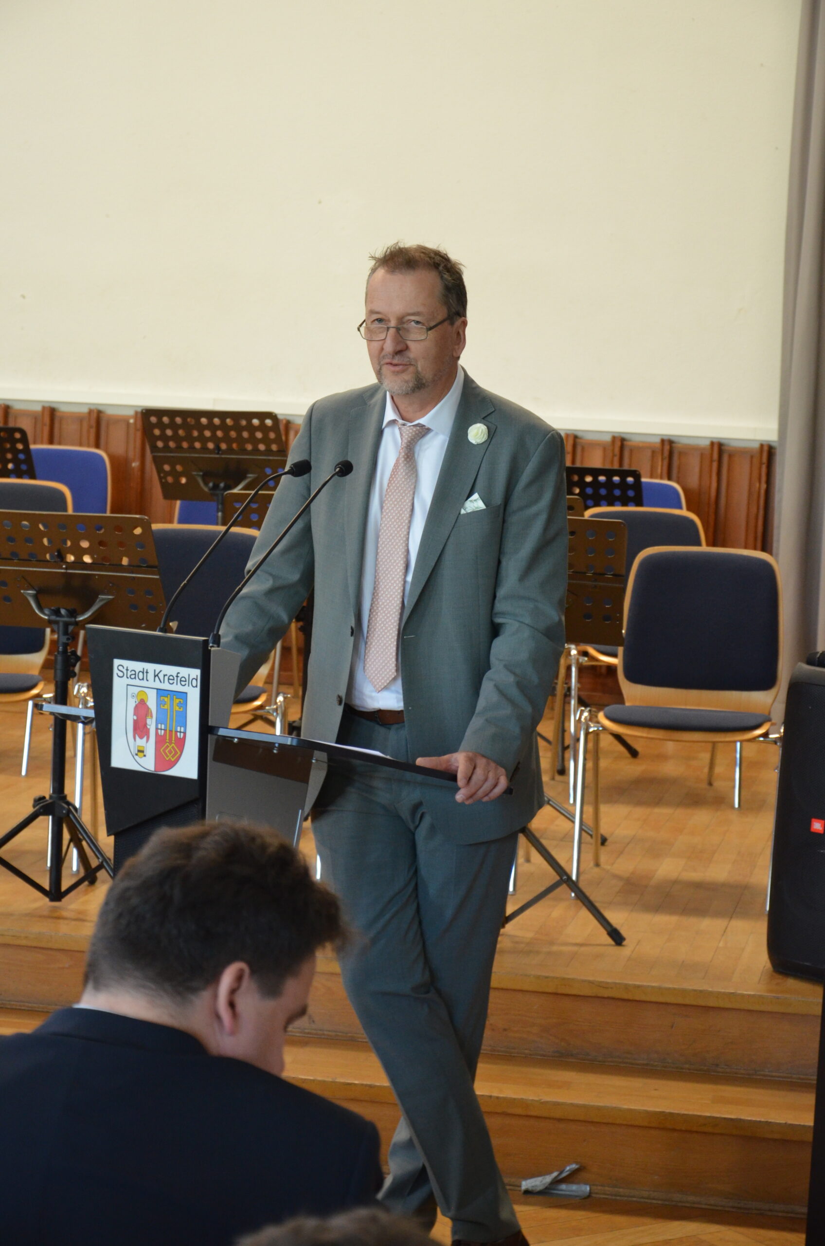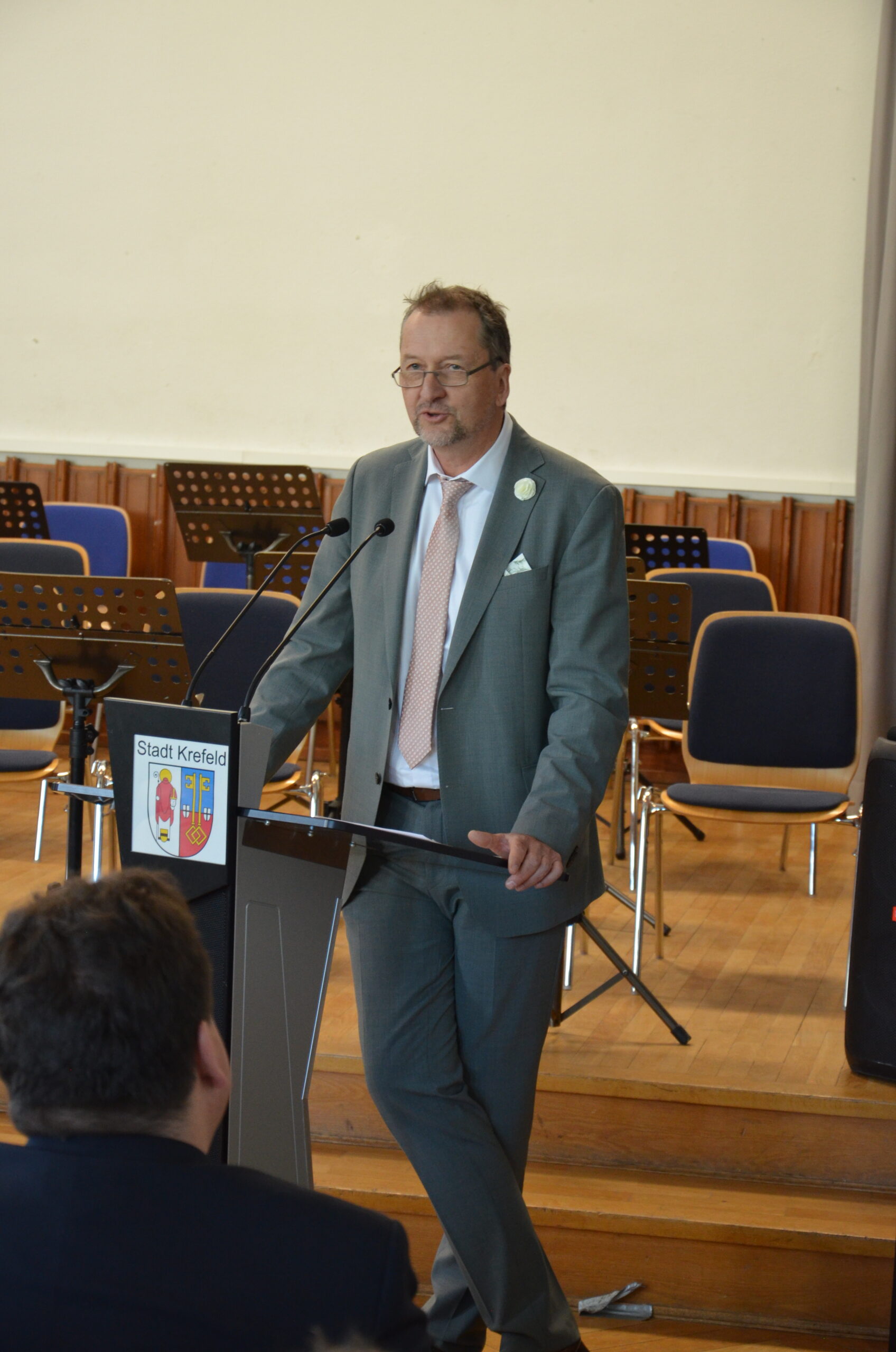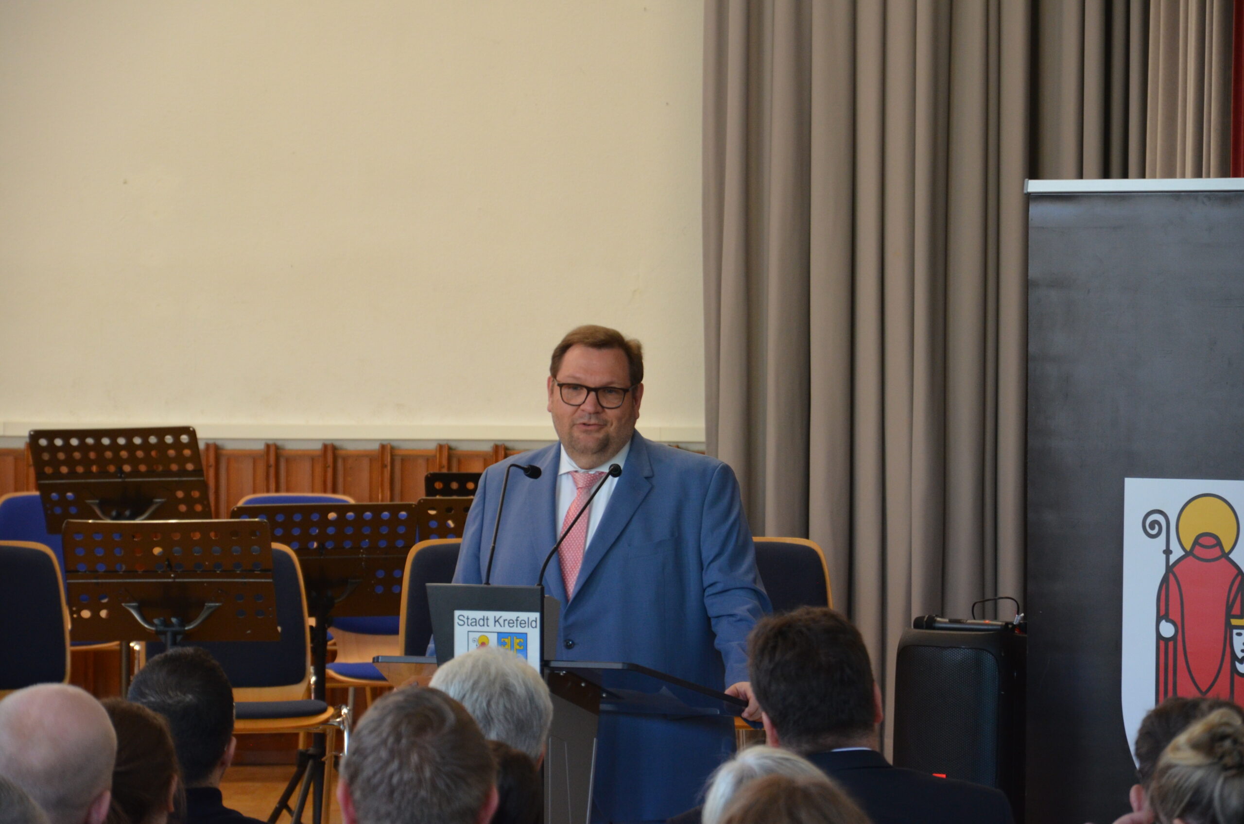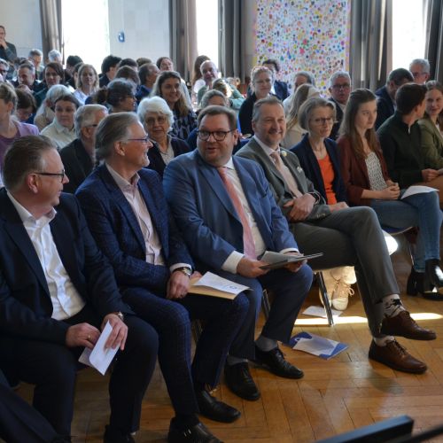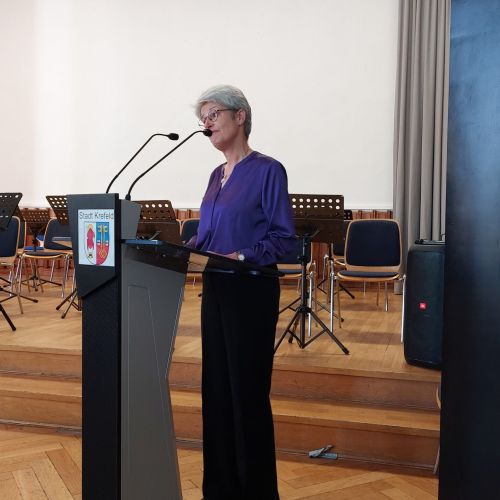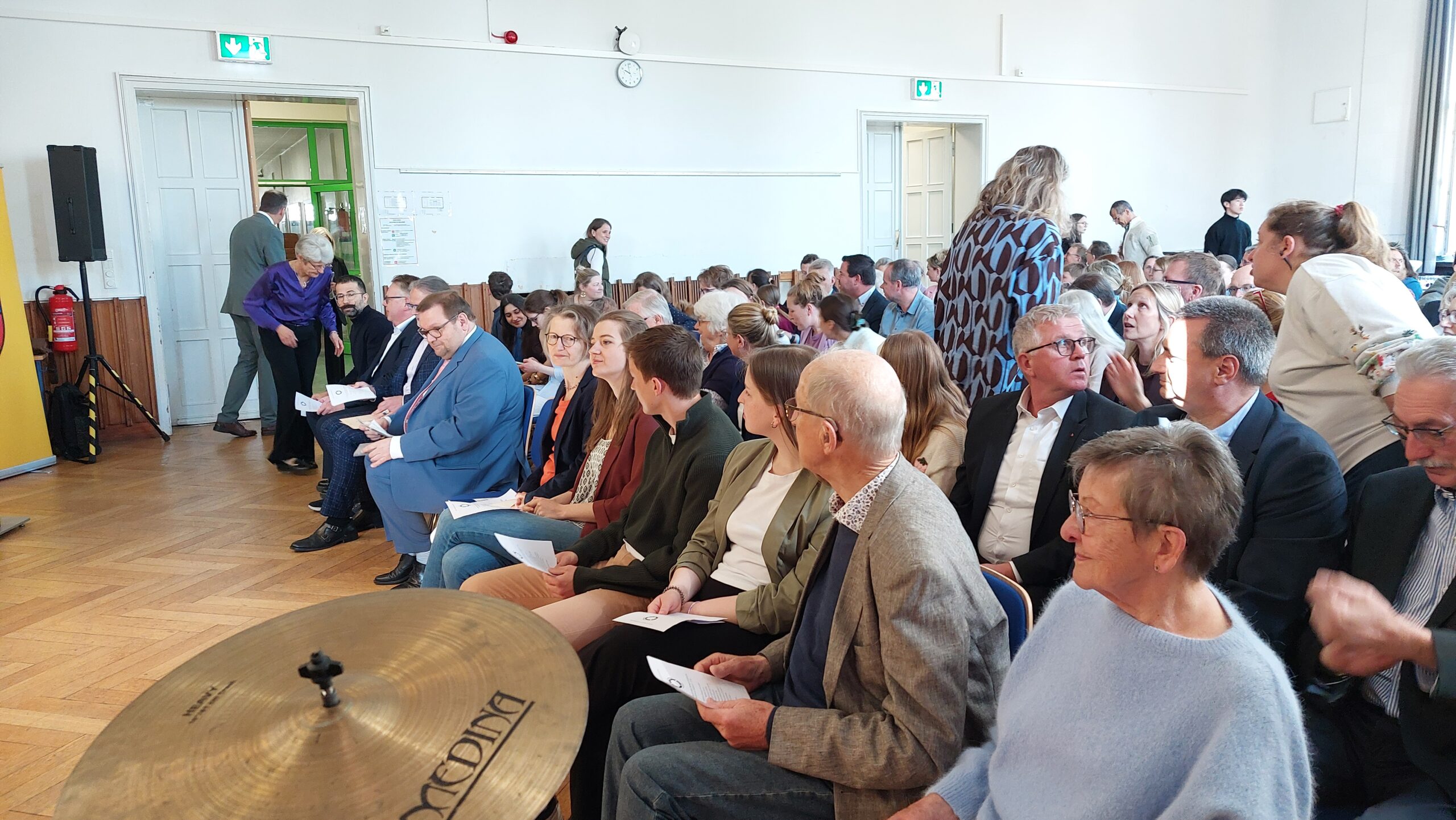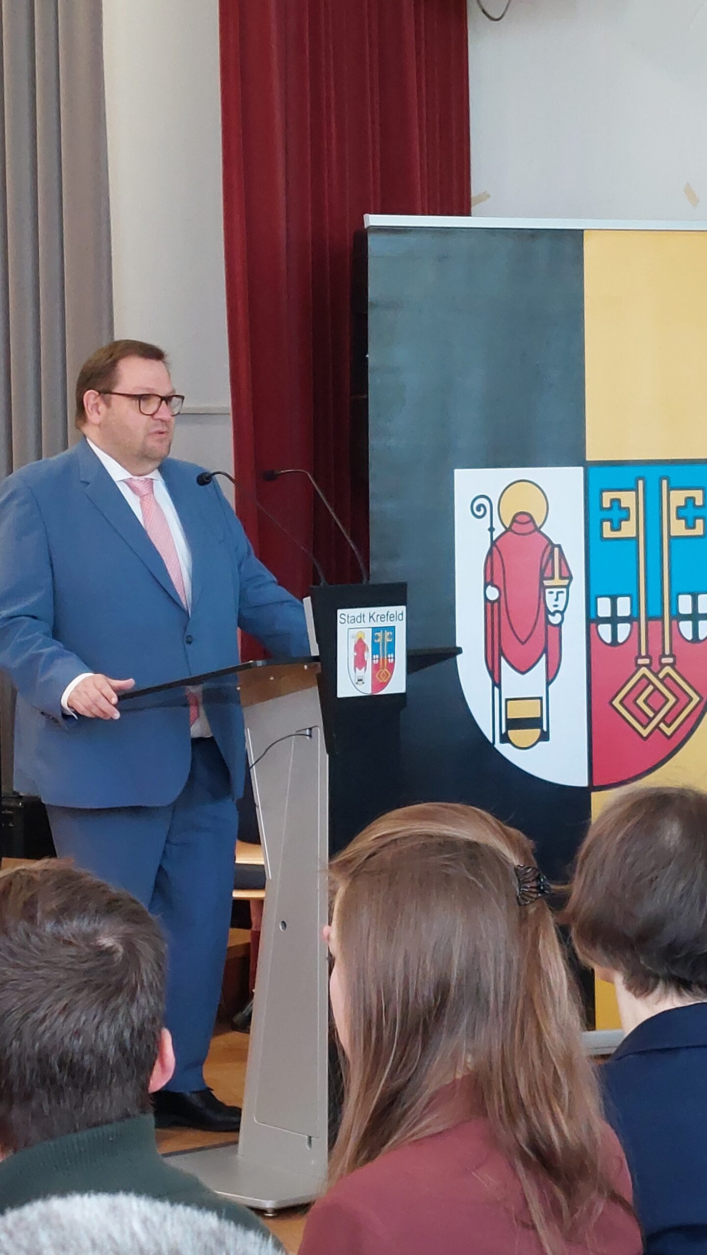 Oberbürgermeister Frank Meyer, Schuldezernent Stefan Holtschneider, Landtagsabgeordneter Marc Blondin, um nur einige zu nennen: Viel Prominenz war zur offiziellen und feierlichen Amtseinführung von Stefan Kleeberg vertreten. Zusammen mit der Familie des neuen Schulleiters, den Kolleginnen und Kollegen, Vertreterinnen und Vertretern aus der Schülerschaft, der Elternschaft und vielen weiteren Weggefährtinnen und -gefährten wurde dieses Ereignis in der prall gefüllten Aula gebührend begangen und gefeiert. Das nicht nur in verschiedenen Reden, wie z.B. durch den Oberbürgermeister und ehemaligen Schüler des Gymnasiums in Personalunion, sondern auch mit musikalischen Beiträgen oder einem heiteren Abschluss-Quiz, das Stefan Kleeberg mit Bravour bestand.
