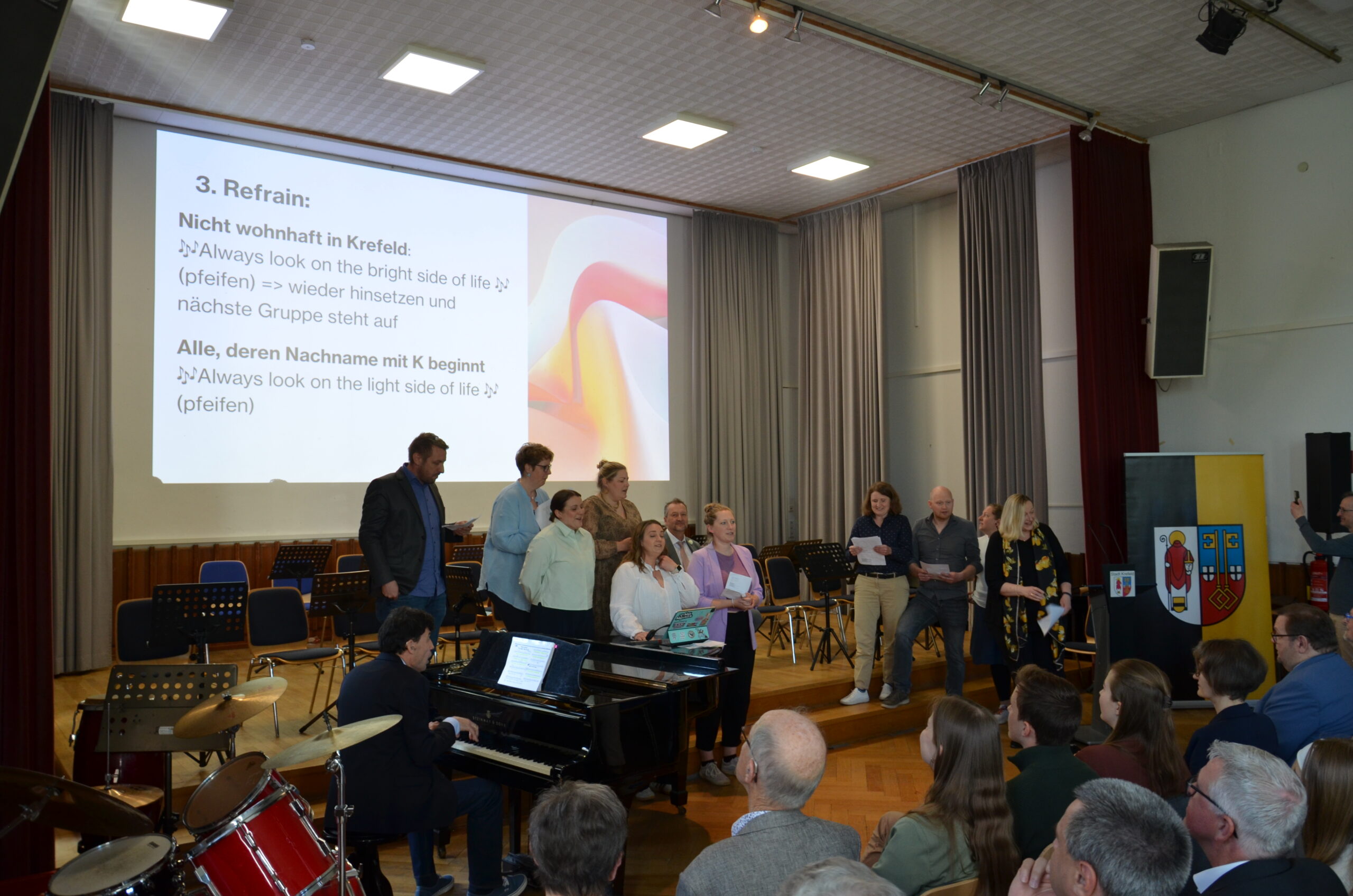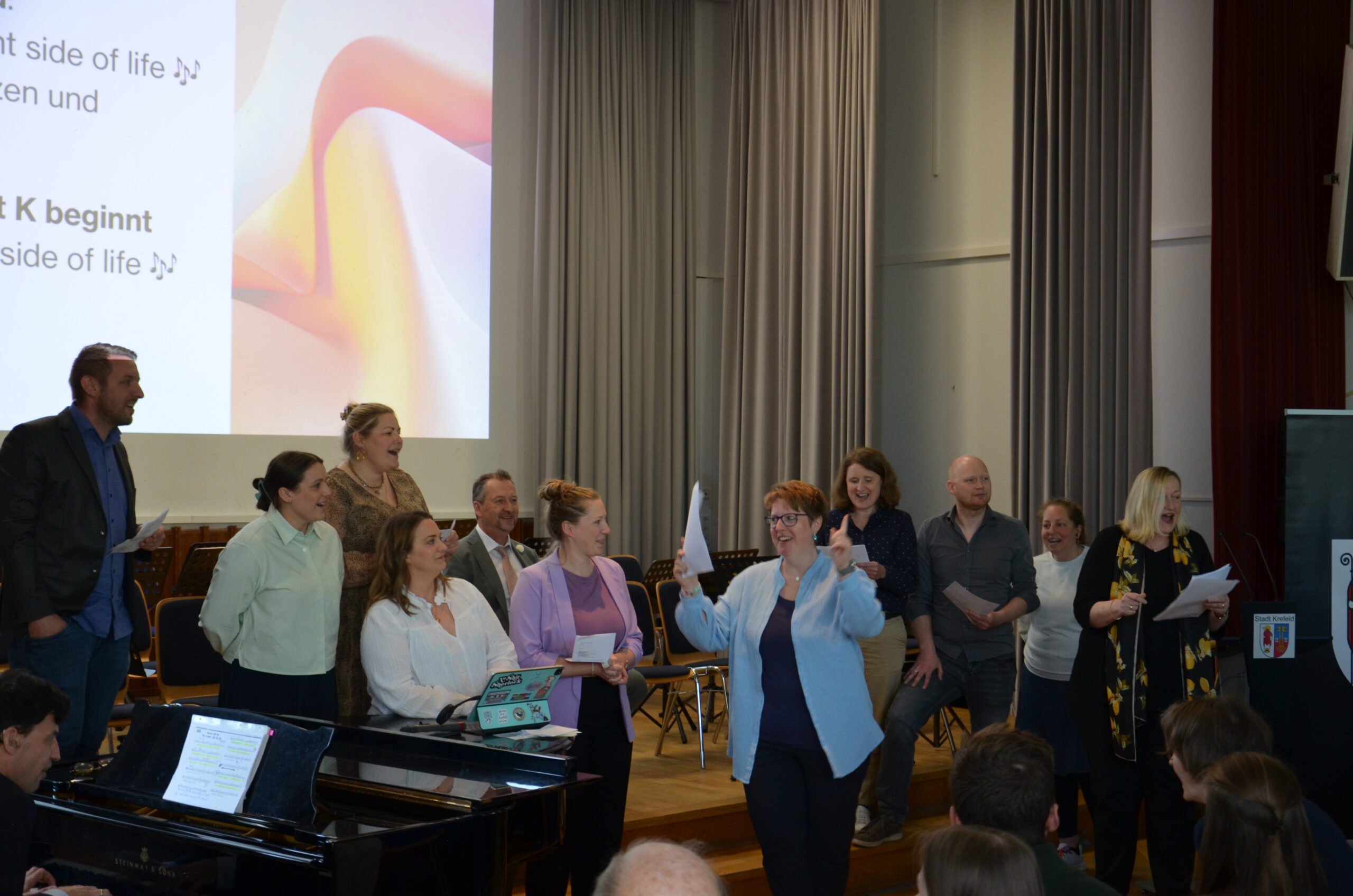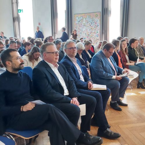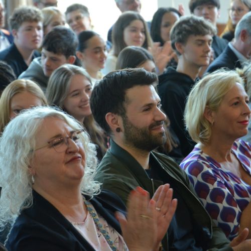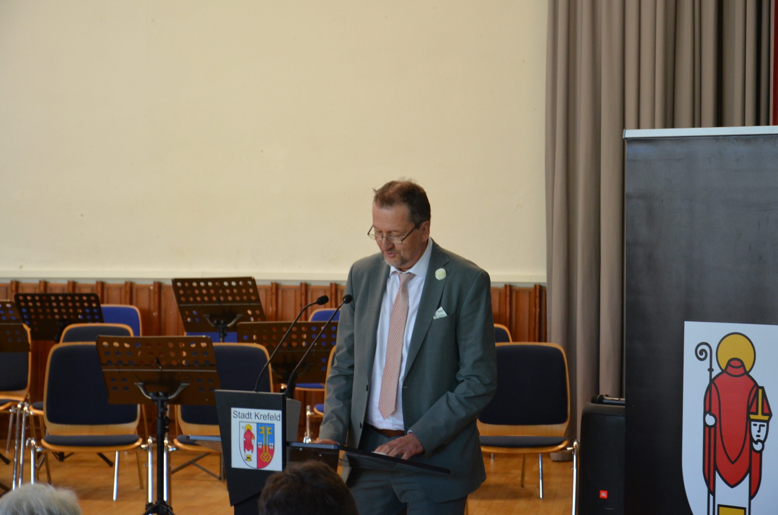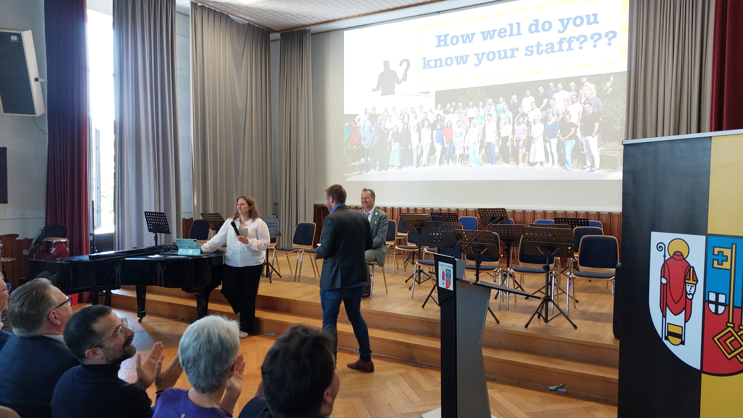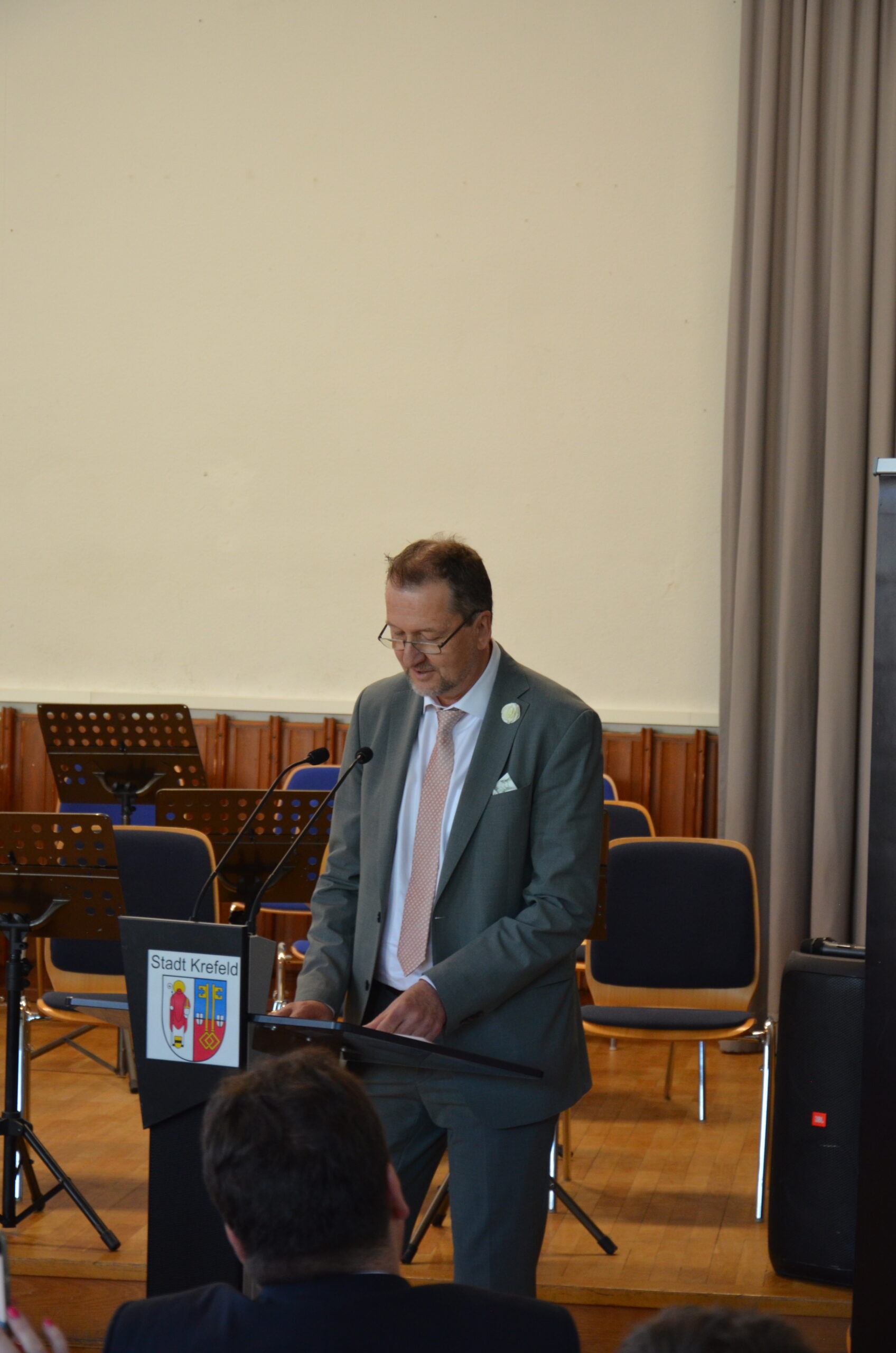 Oberbürgermeister Frank Meyer, Schuldezernent Stefan Holtschneider, Landtagsabgeordneter Marc Blondin, um nur einige zu nennen: Viel Prominenz war zur offiziellen und feierlichen Amtseinführung von Stefan Kleeberg vertreten. Zusammen mit der Familie des neuen Schulleiters, den Kolleginnen und Kollegen, Vertreterinnen und Vertretern aus der Schülerschaft, der Elternschaft und vielen weiteren Weggefährtinnen und -gefährten wurde dieses Ereignis in der prall gefüllten Aula gebührend begangen und gefeiert. Das nicht nur in verschiedenen Reden, wie z.B. durch den Oberbürgermeister und ehemaligen Schüler des Gymnasiums in Personalunion, sondern auch mit musikalischen Beiträgen oder einem heiteren Abschluss-Quiz, das Stefan Kleeberg mit Bravour bestand.