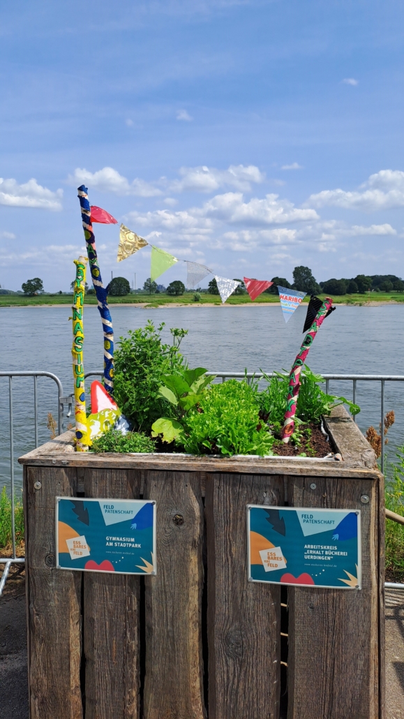 Auch in diesem Jahr beteiligt sich das Gymnasium am Stadtpark wieder an der Rhineside. Unter dem Motto „essbares Krefeld“ haben wir in unserem Beet Essbares für Menschen und Insekten. In der Kunst wurde noch eine nachhaltige Girlande gestaltet, so dass man unser Beet schnell erkennen kann.
